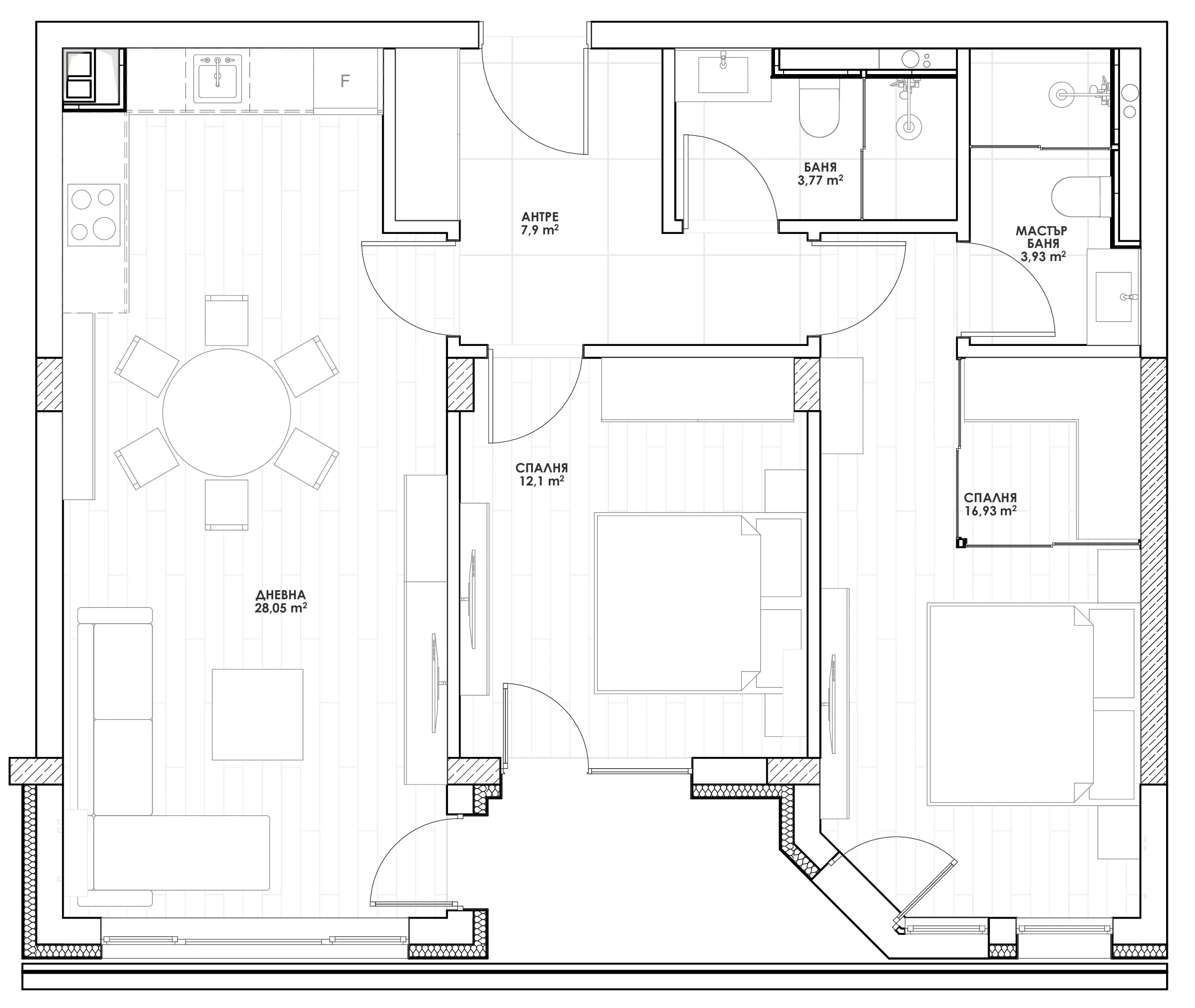 This required creating a concept that could be implemented across every flat in the complex. The interiors needed to be flexible enough to adapt to each resident’s preferences, while also allowing the design to be executed repeatedly with uniform quality.
