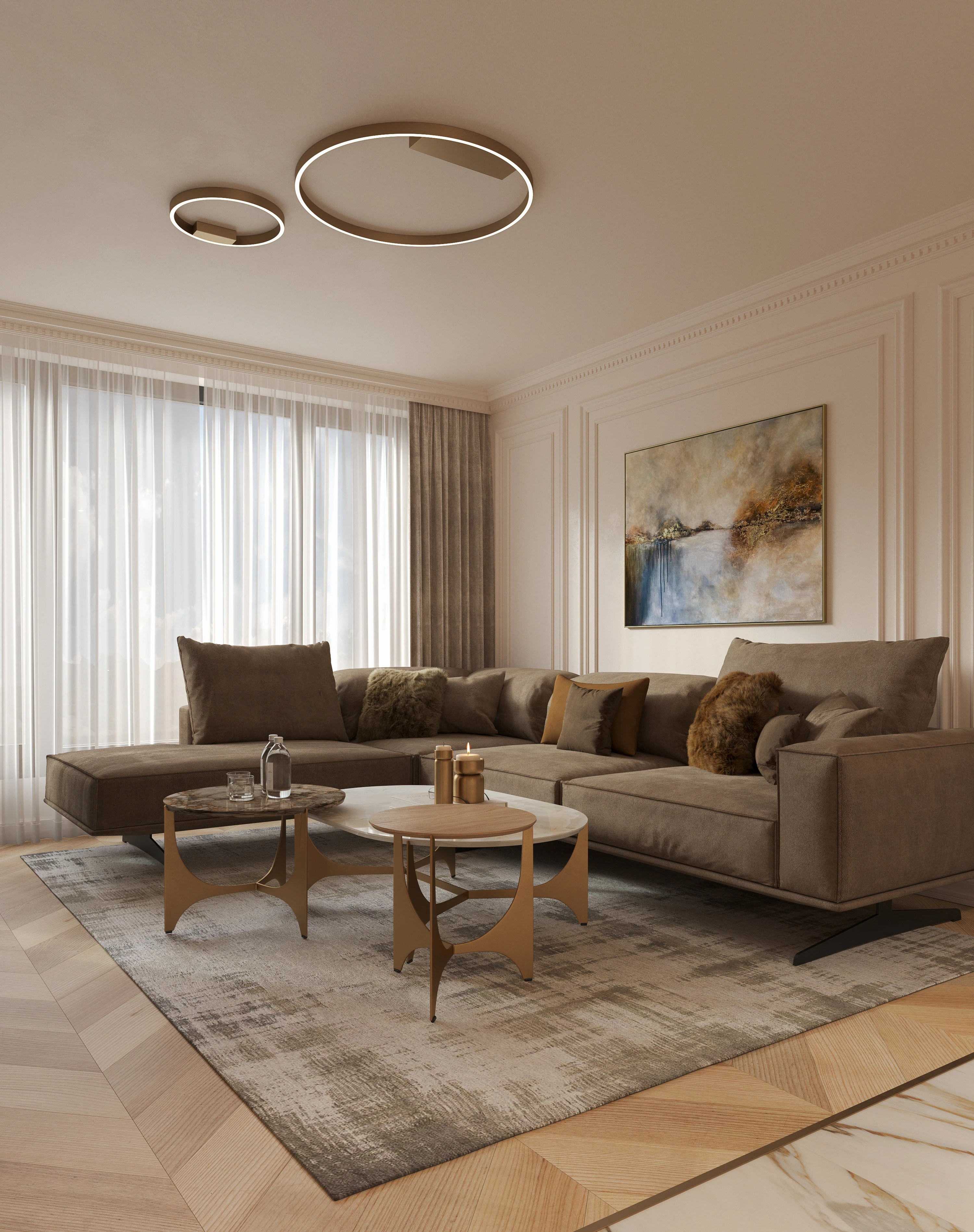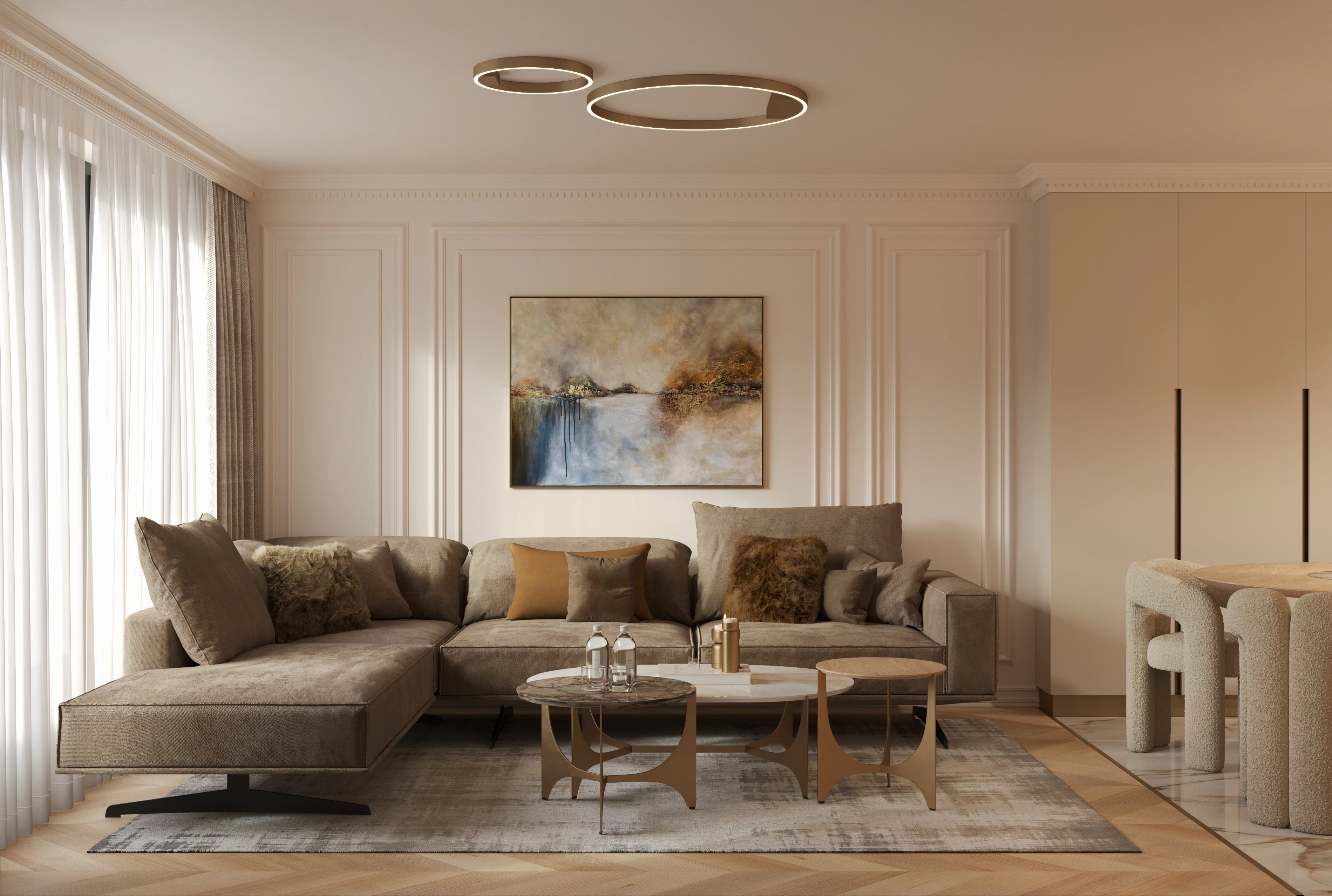 create a timeless, classic feel. This is balanced with modern furniture, and classy brass accents that
