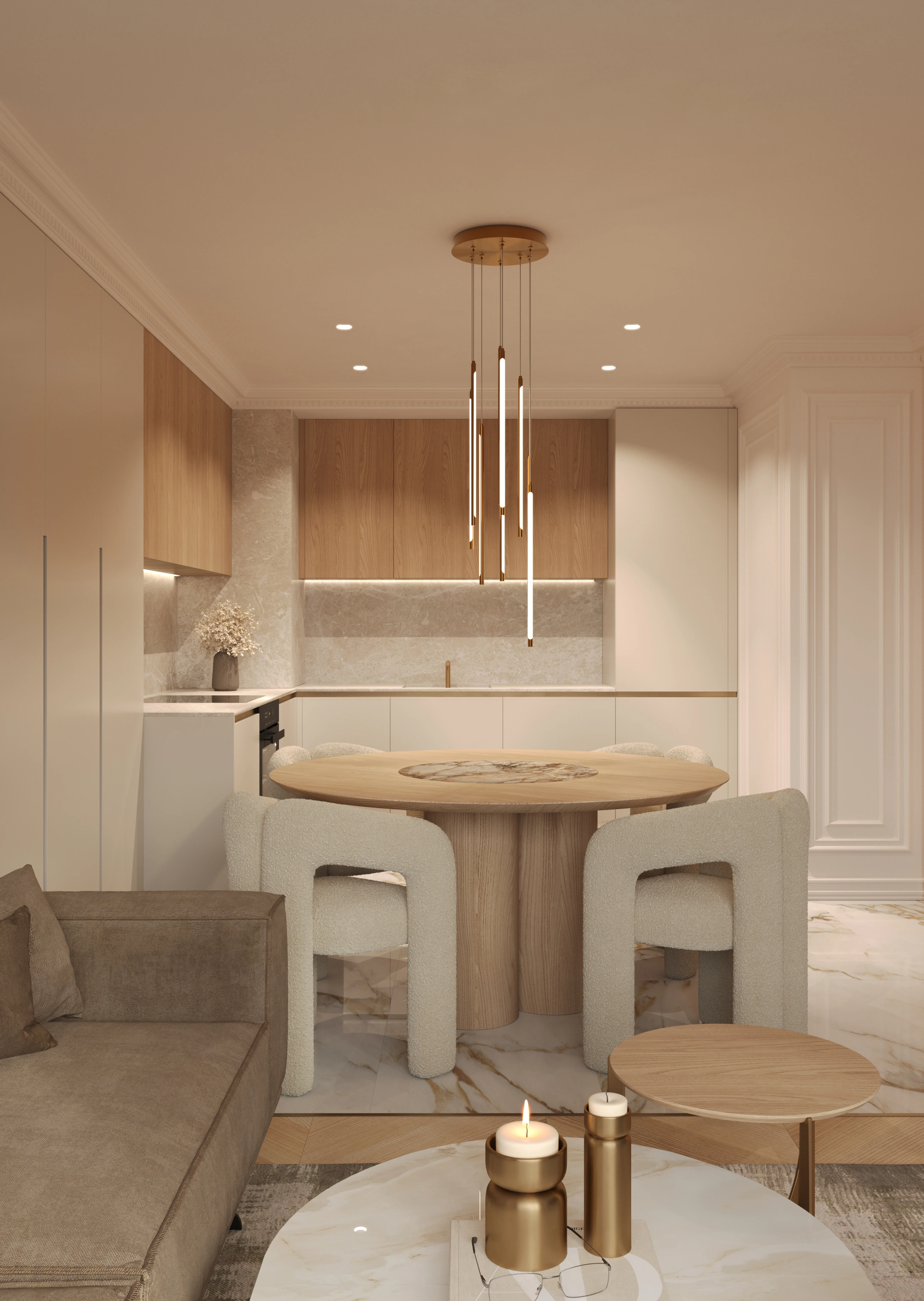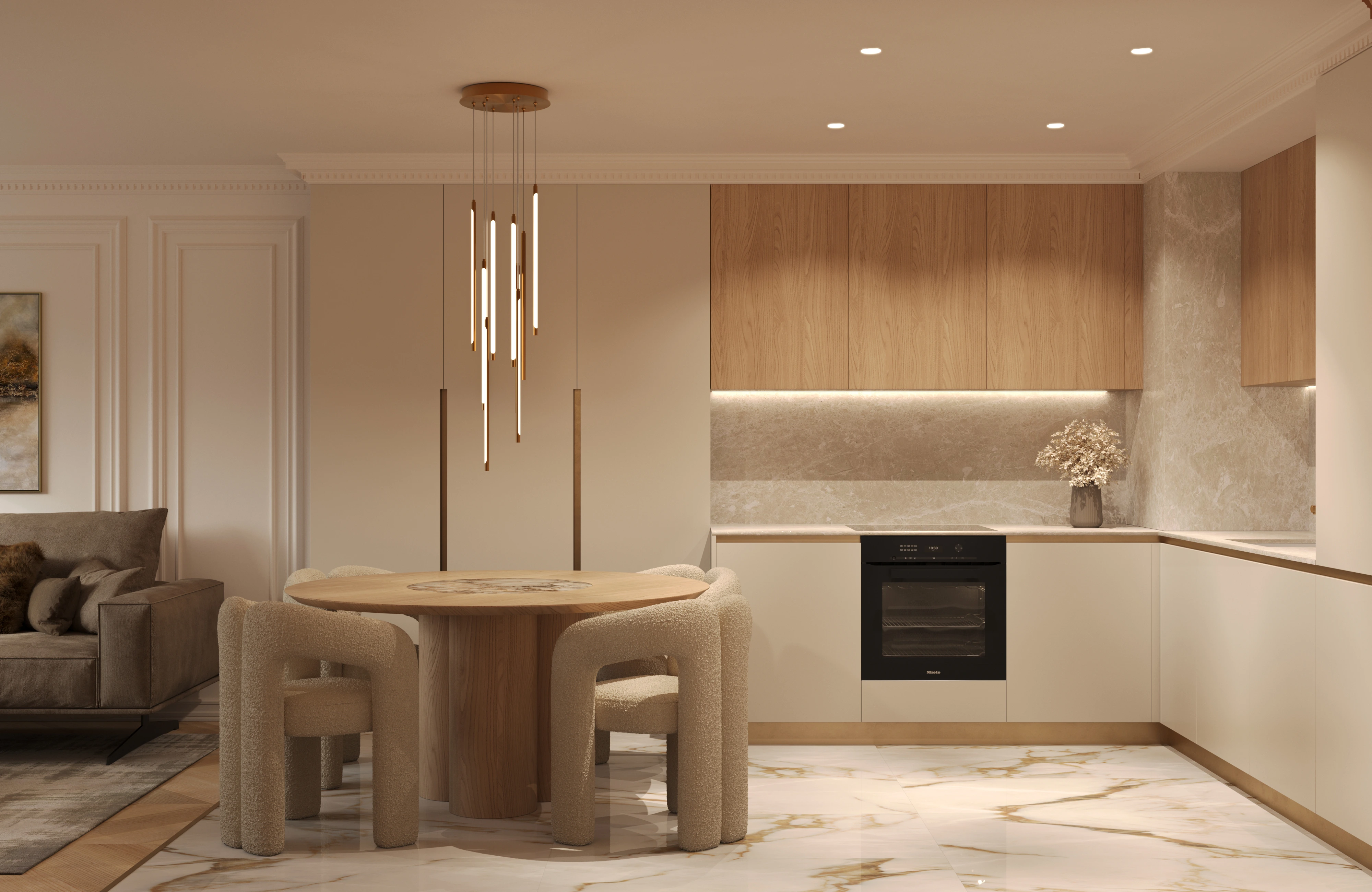 One of the main design goals guiding our work was to develop a modular interior system. This approach enables residents to change colors, materials, or decorative elements without affecting the overall style and atmosphere of the apartment. We aimed to establish a clear design vision that creates a unified identity across all apartments and reflects the style of the building.