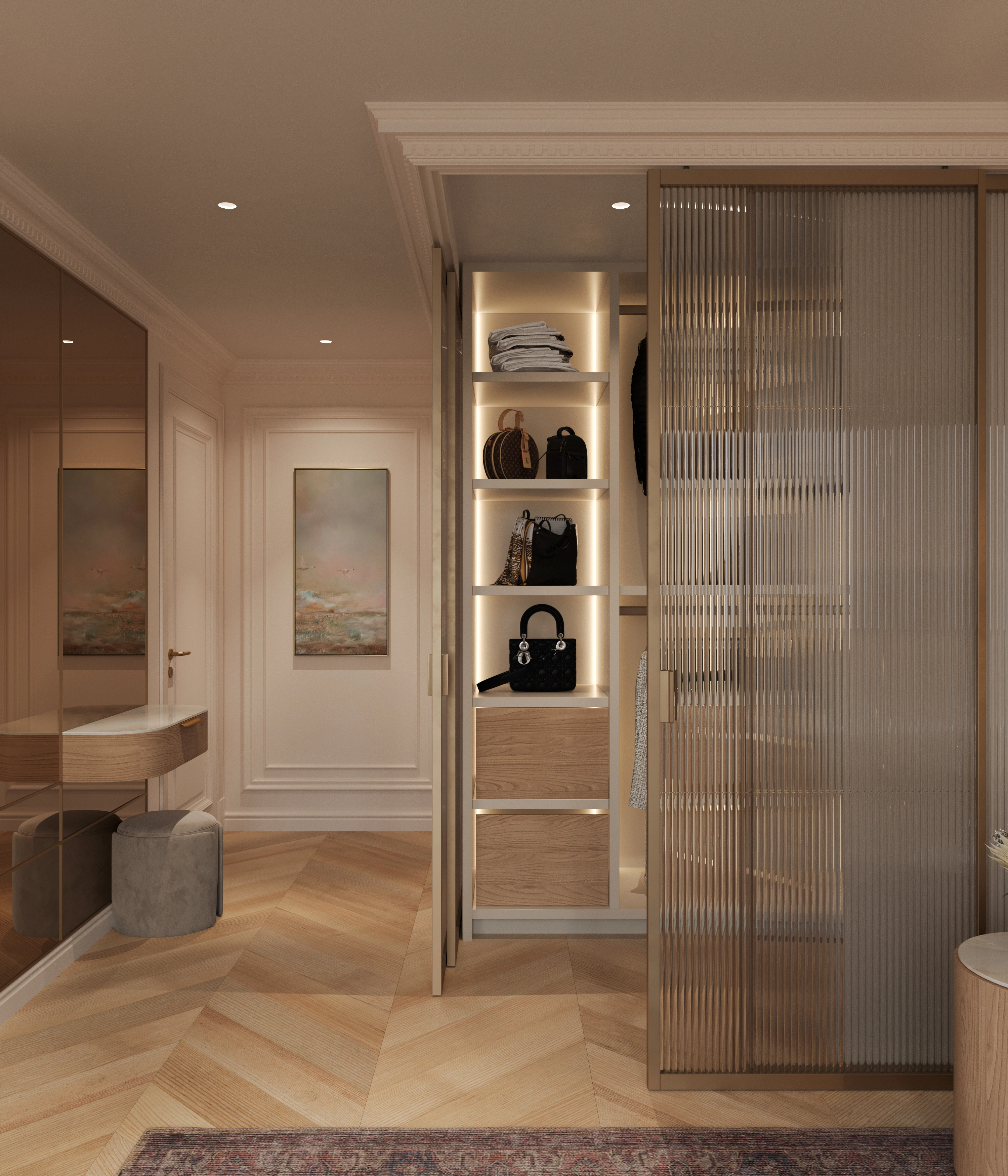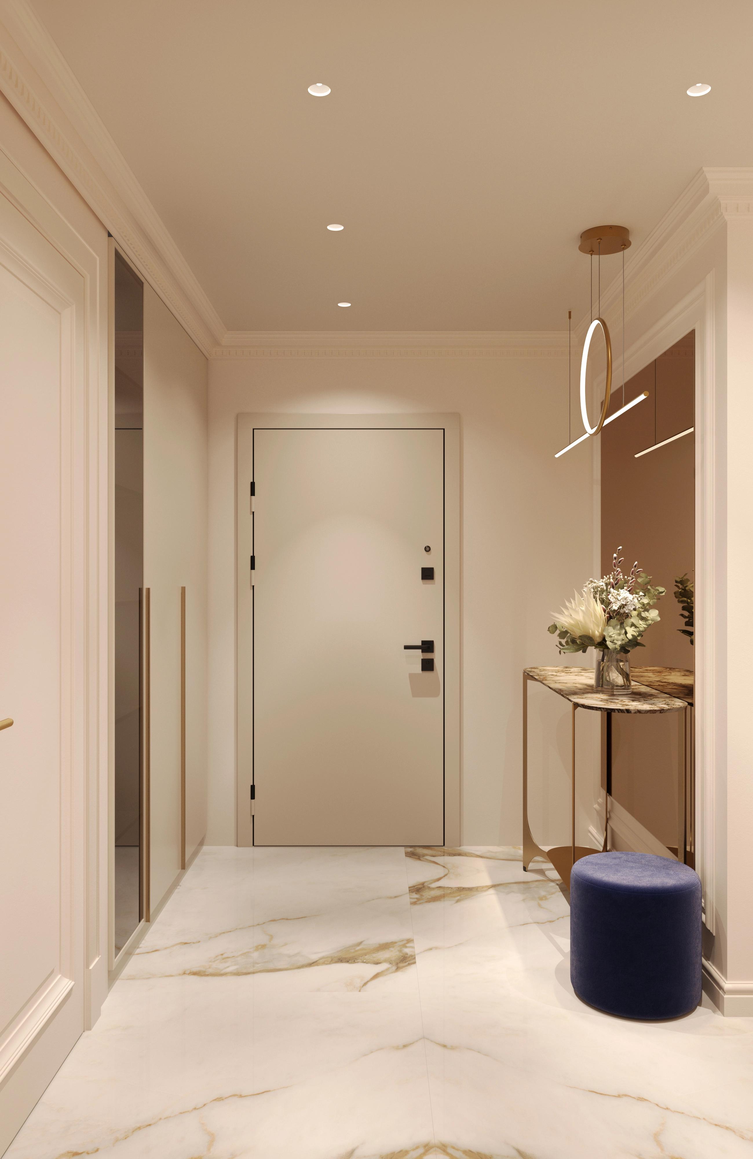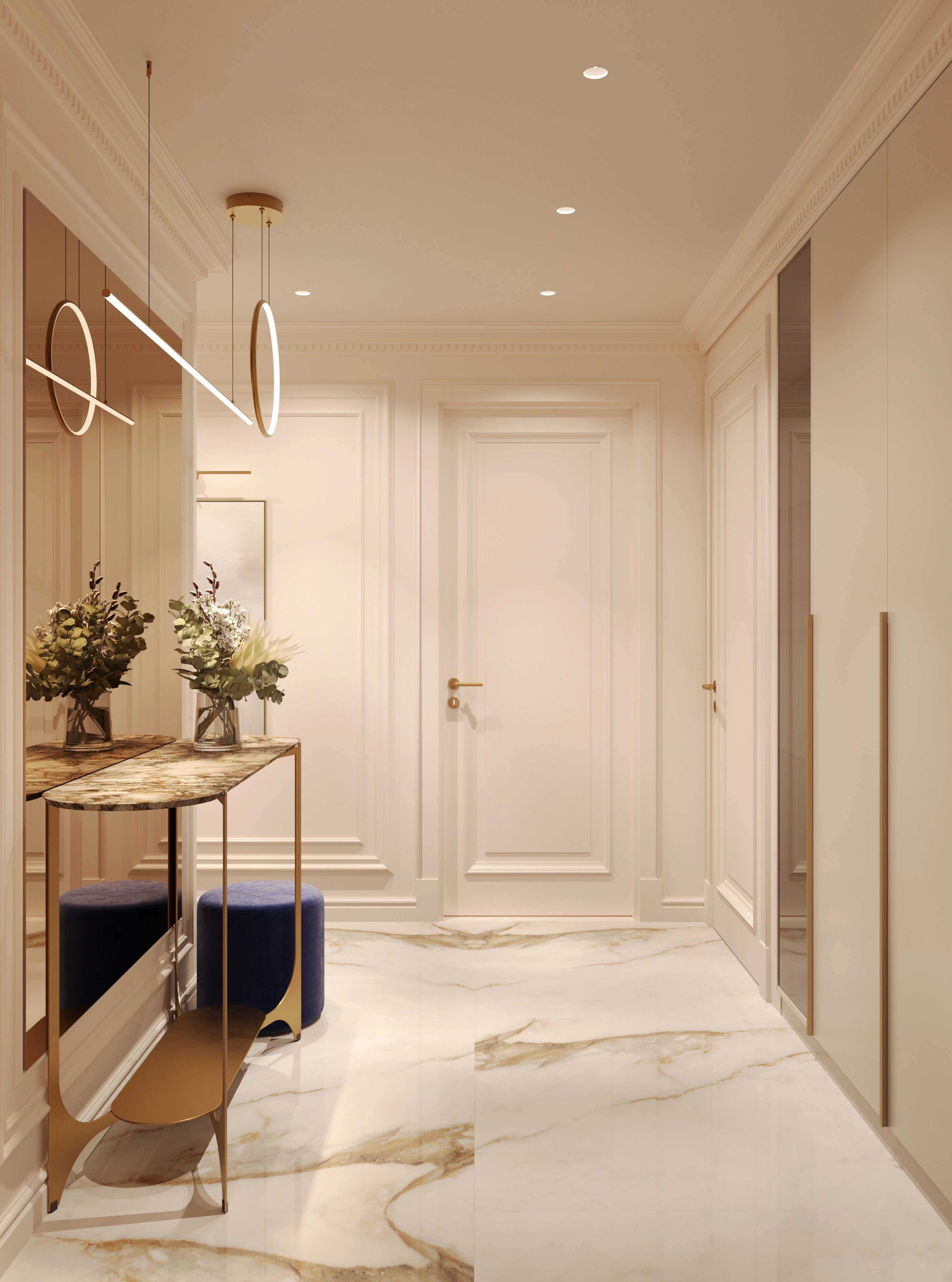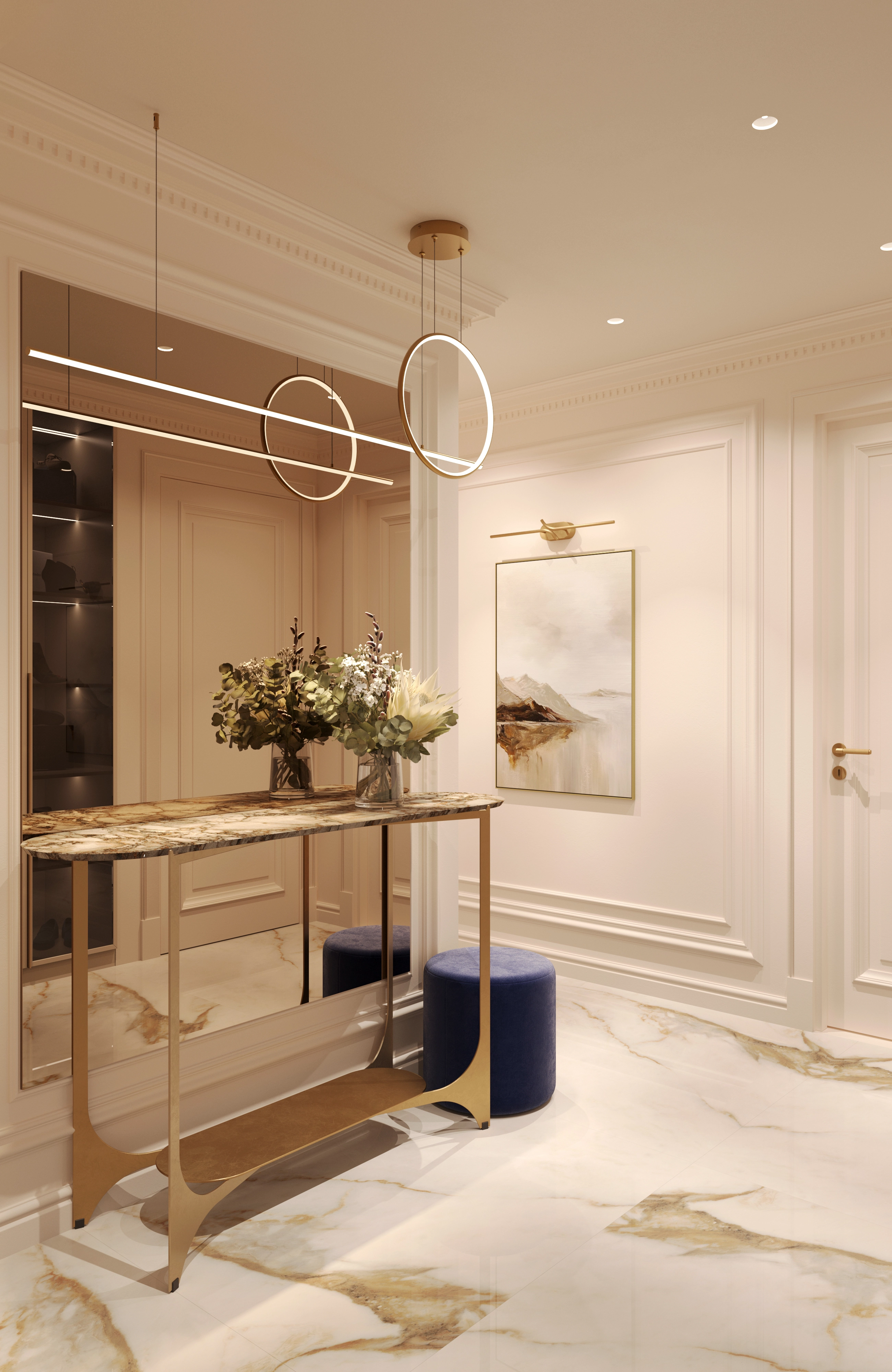 We challenged the conventions of the luxury style by blending its typical glossy opulence and neoclassical elements with light, warm tones and materials. The goal was to soften the heavy impact of the usual ornamented excess, and to create an overall feeling of comfort. We set out to keep the premium feel and quality, while removing everything unnecessary.