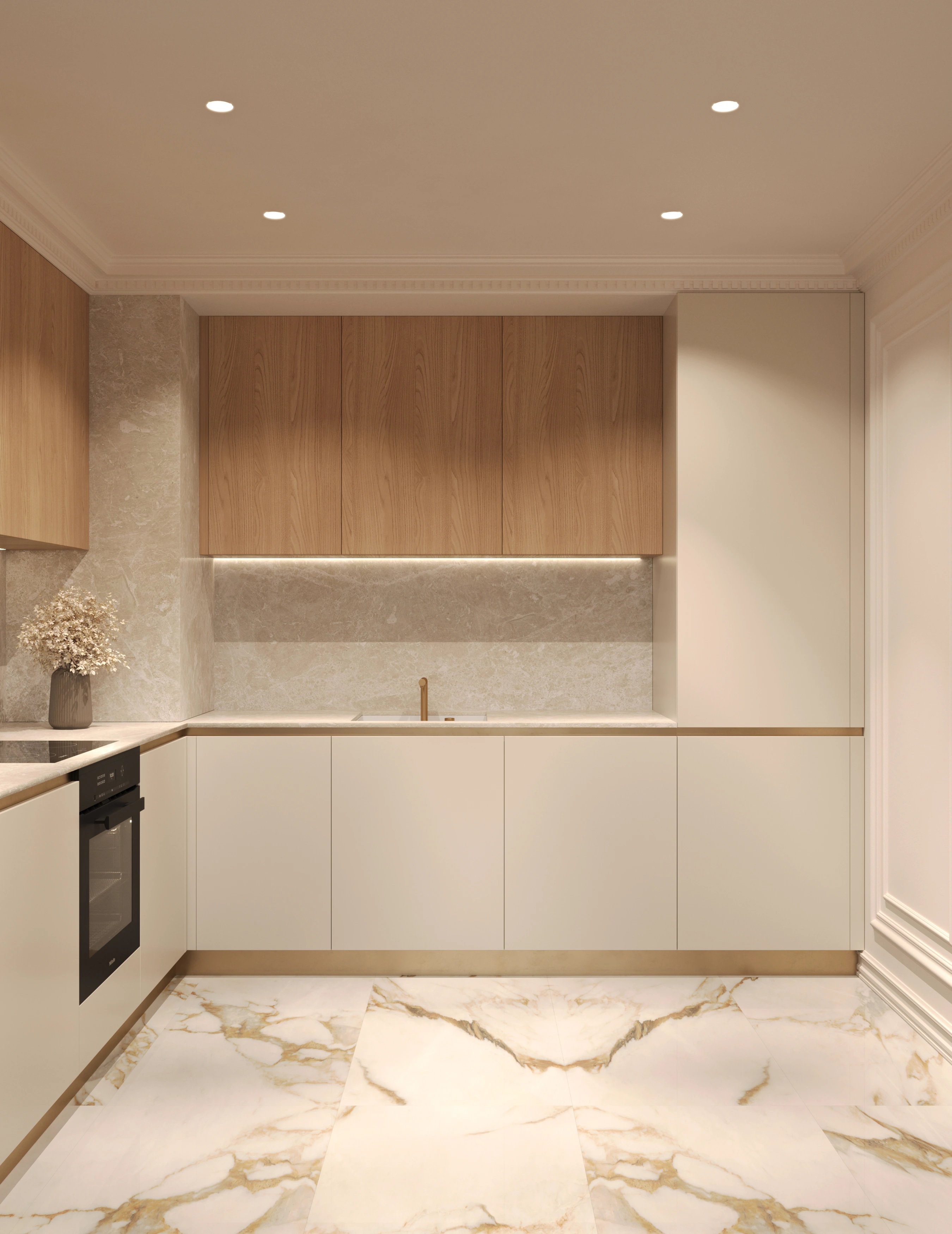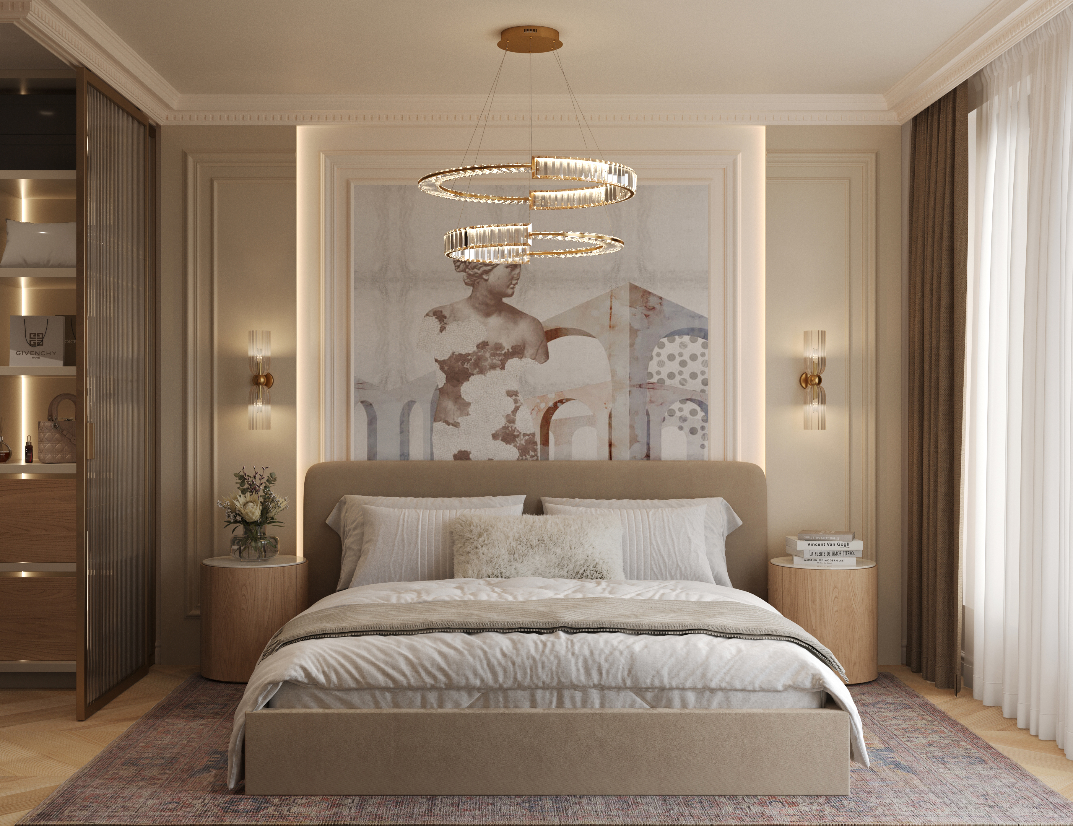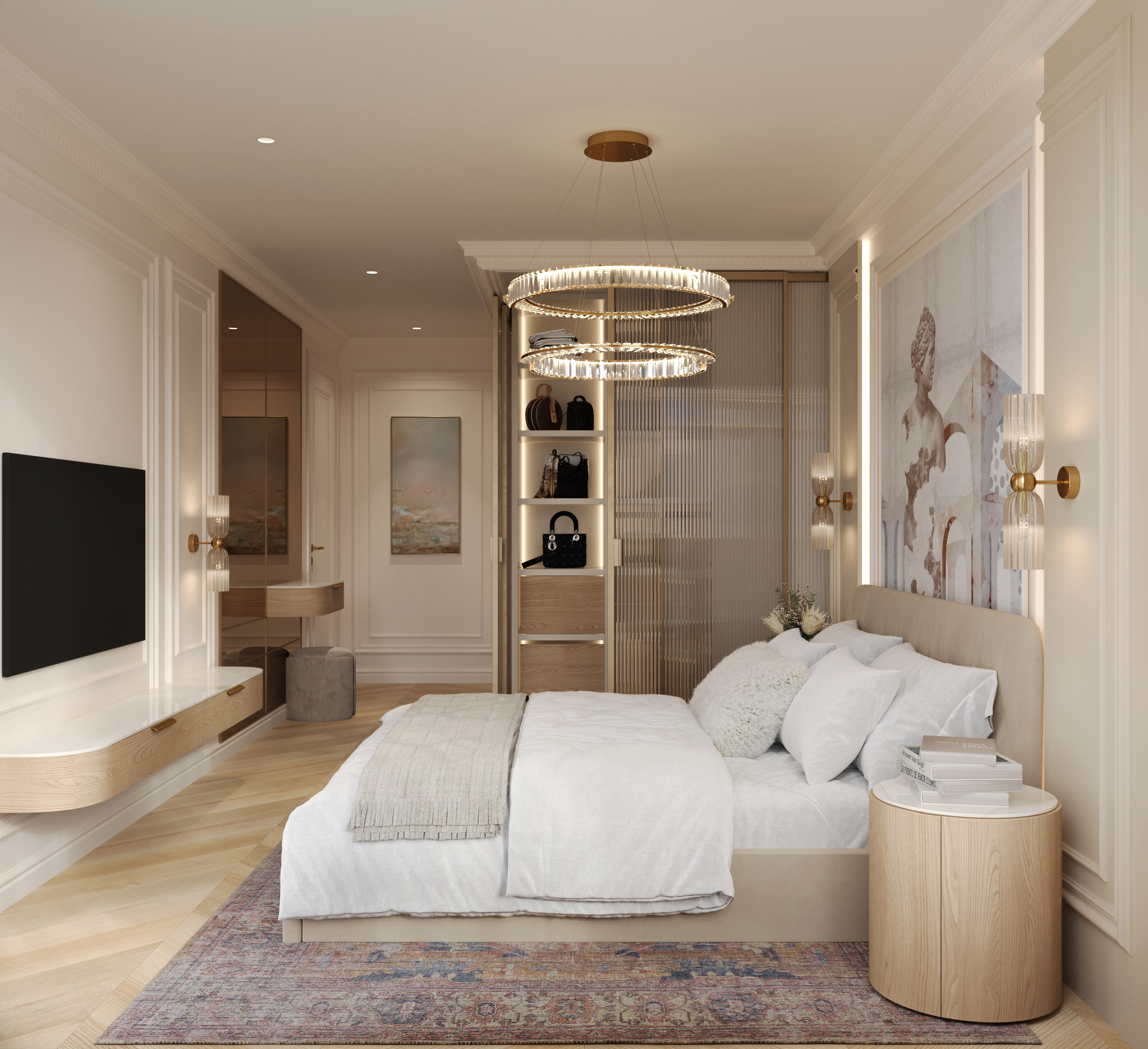 We challenged the conventions of the luxury style by blending its typical glossy opulence and neoclassical elements with light, warm tones and materials. The goal was to soften the heavy impact of the usual ornamented excess, and to create an overall feeling of comfort. We set out to keep the premium feel and quality, while removing everything unnecessary.